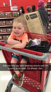 In the Target parking lot, I proceed to undress my child. What we have for extras is a pair of shorts, well good thing the snow has stopped, because that’s what you’re going to wear. I change his t-shirt. And off we go for a new car seat. And an extra change of clothes, incase, Lord help me, we are met with this epic disaster for a second time on the way home.